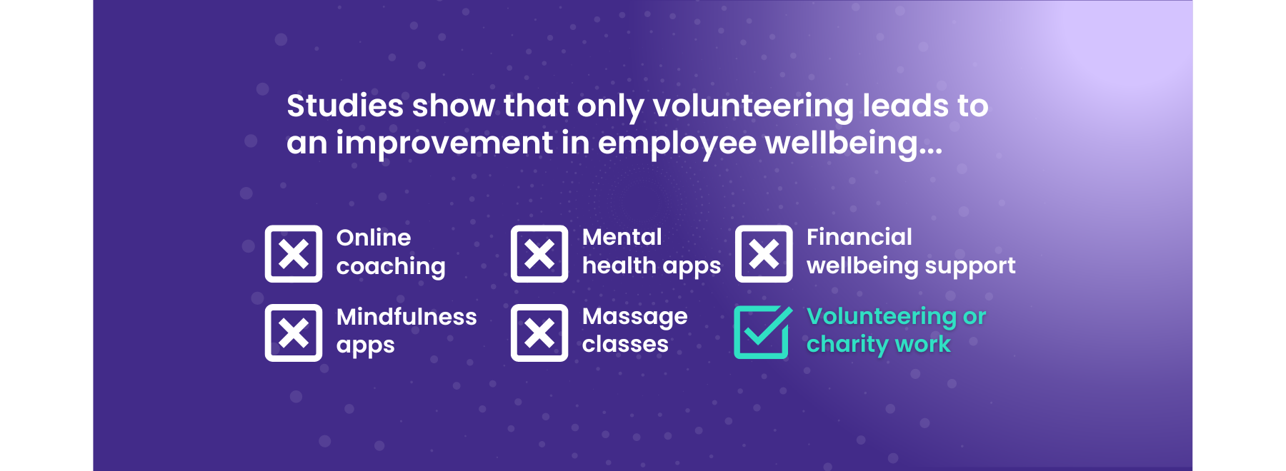 A recent study from Oxford University has proven that amidst a plethora of popular wellbeing benefits such as online coaching, mental and physical health apps, and financial literacy support, volunteering stands alone in its efficacy to improve the overall wellbeing of surveyed employees.